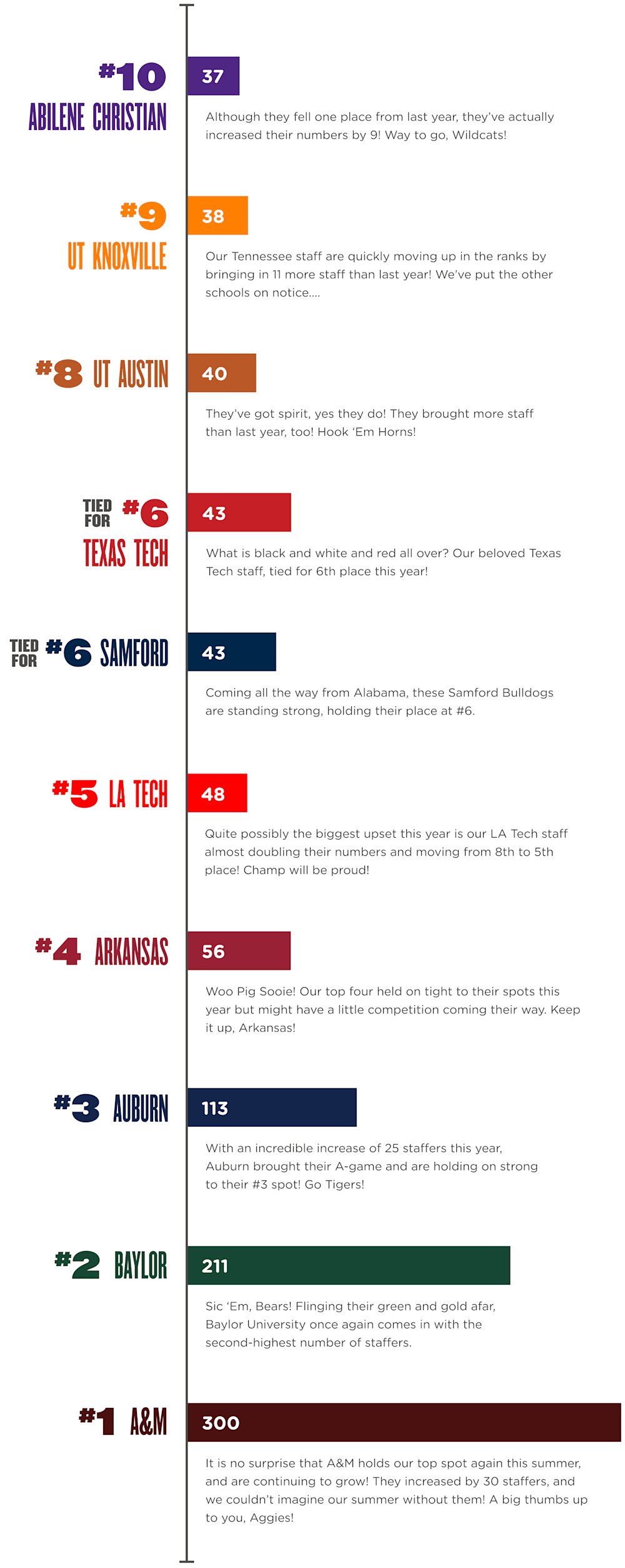 We can’t wait to see how many staffers will come from these schools (or new schools!) next summer! College students, take this as a little healthy competition and tell your friends to apply!